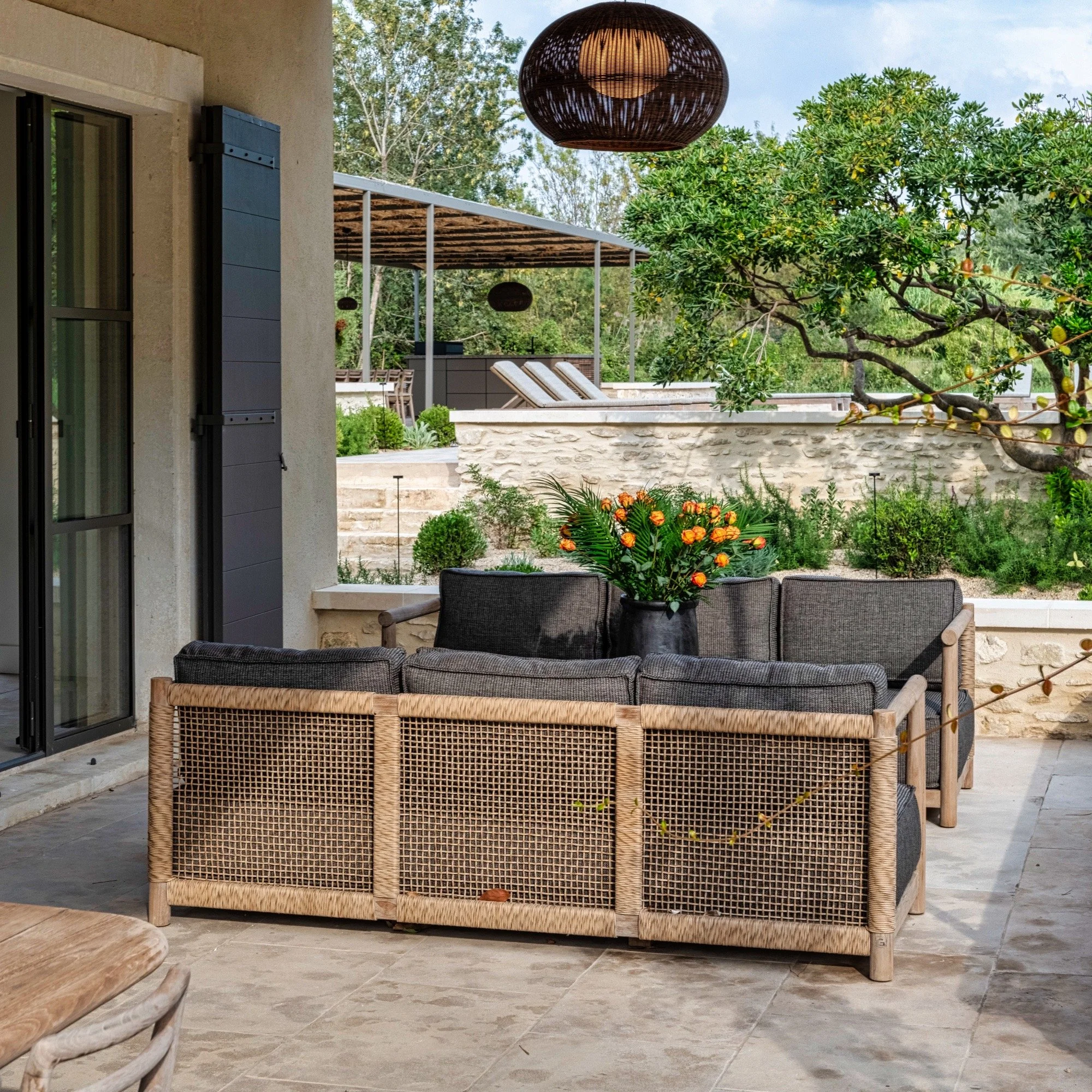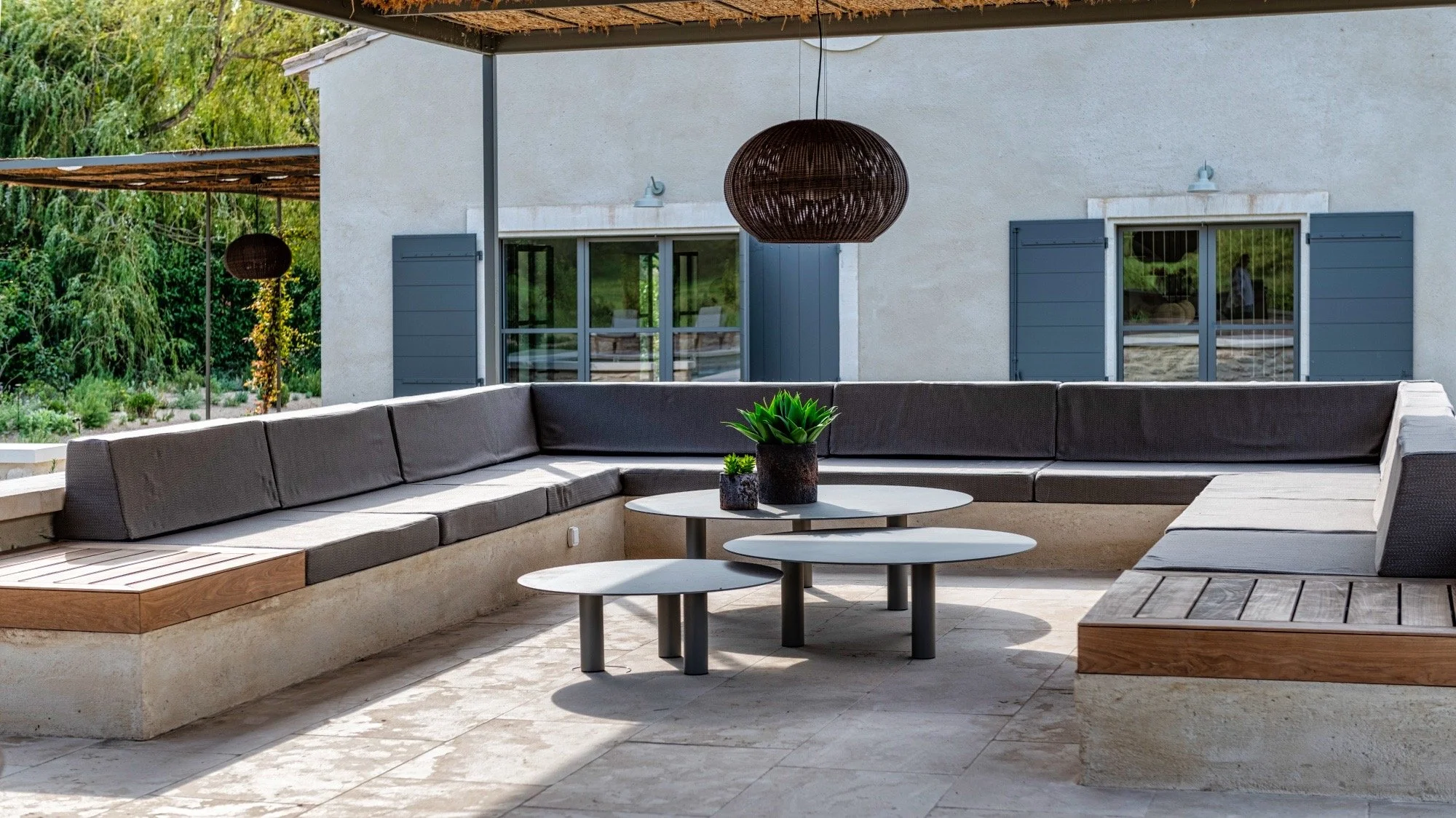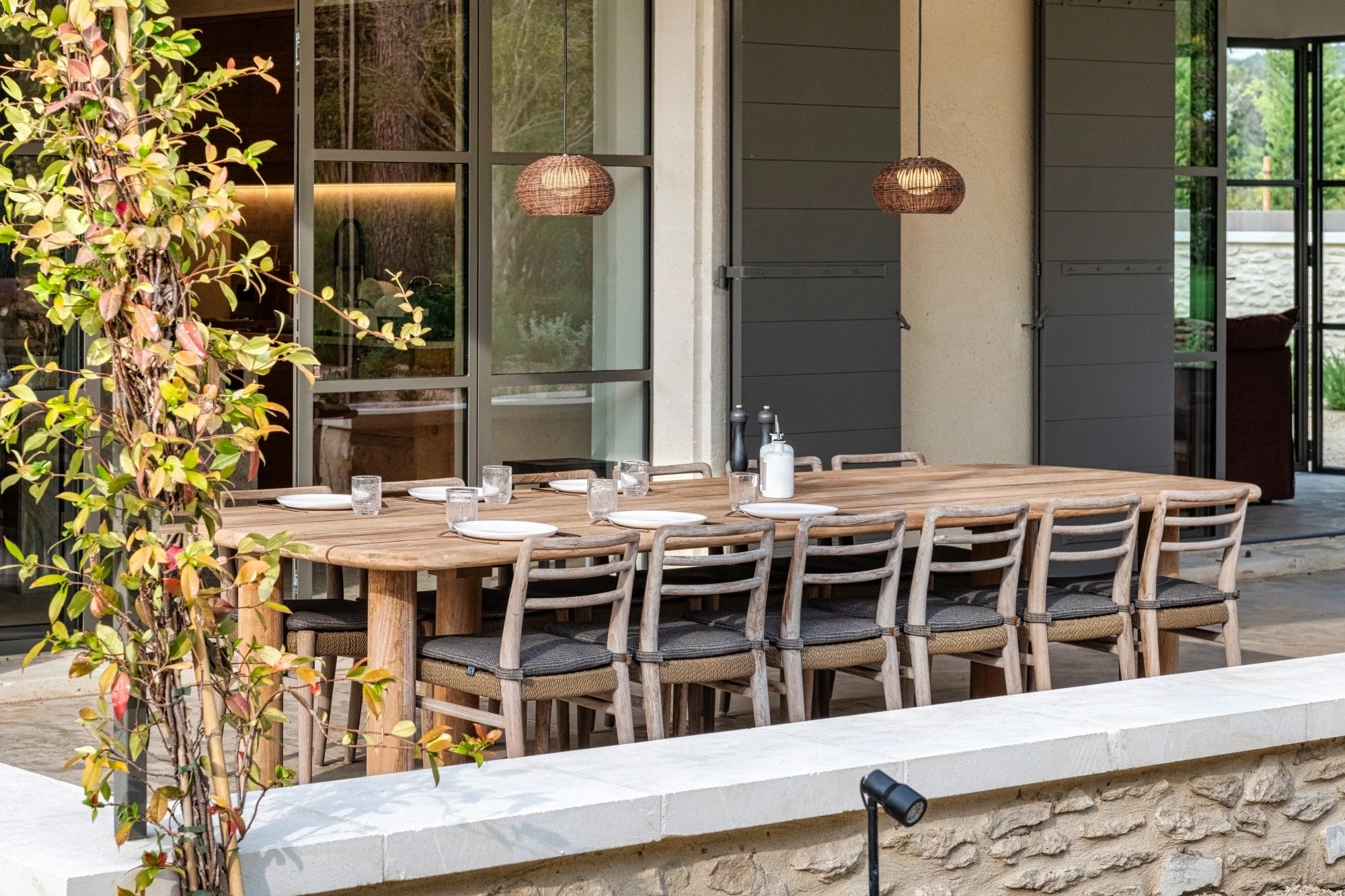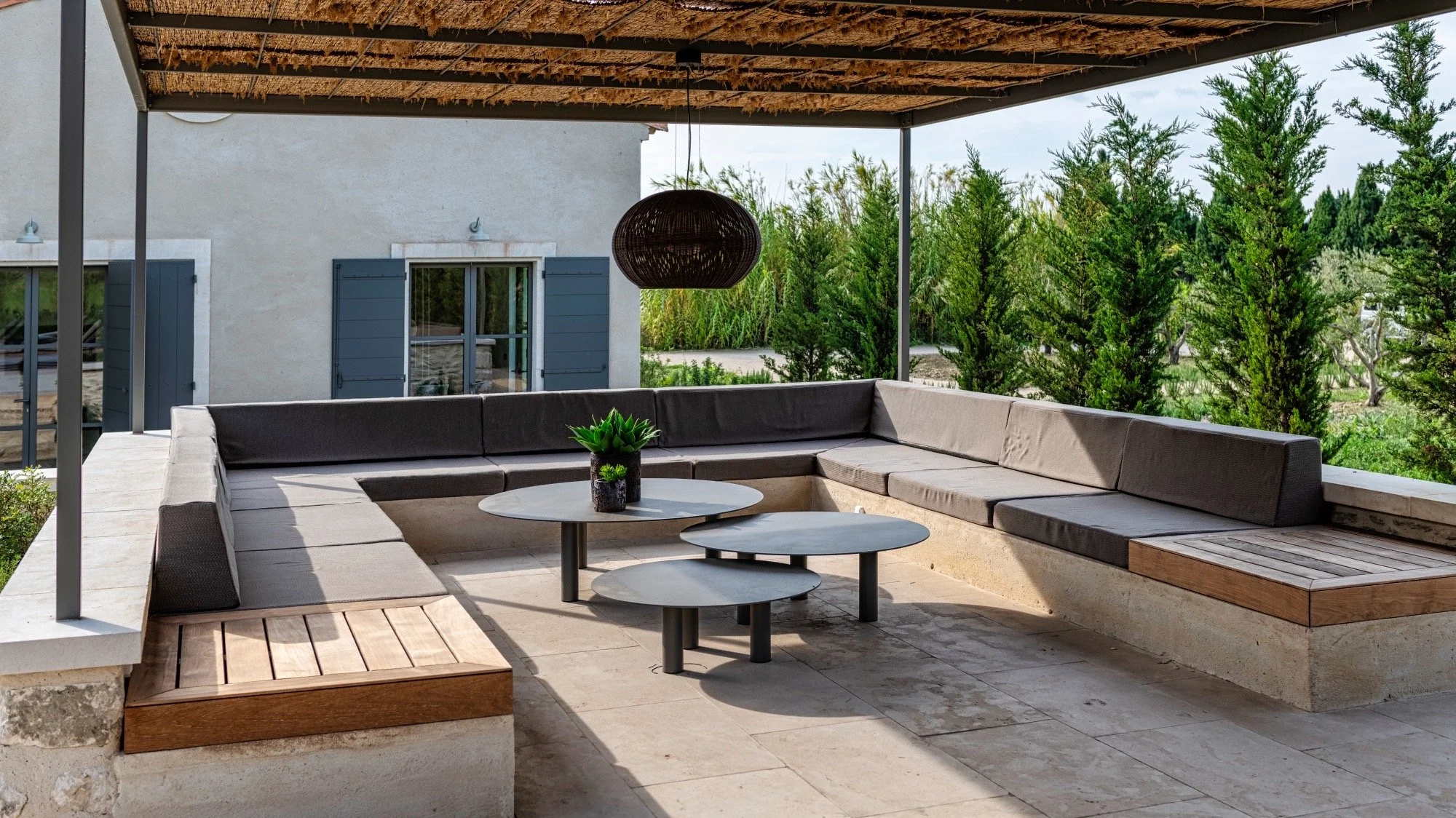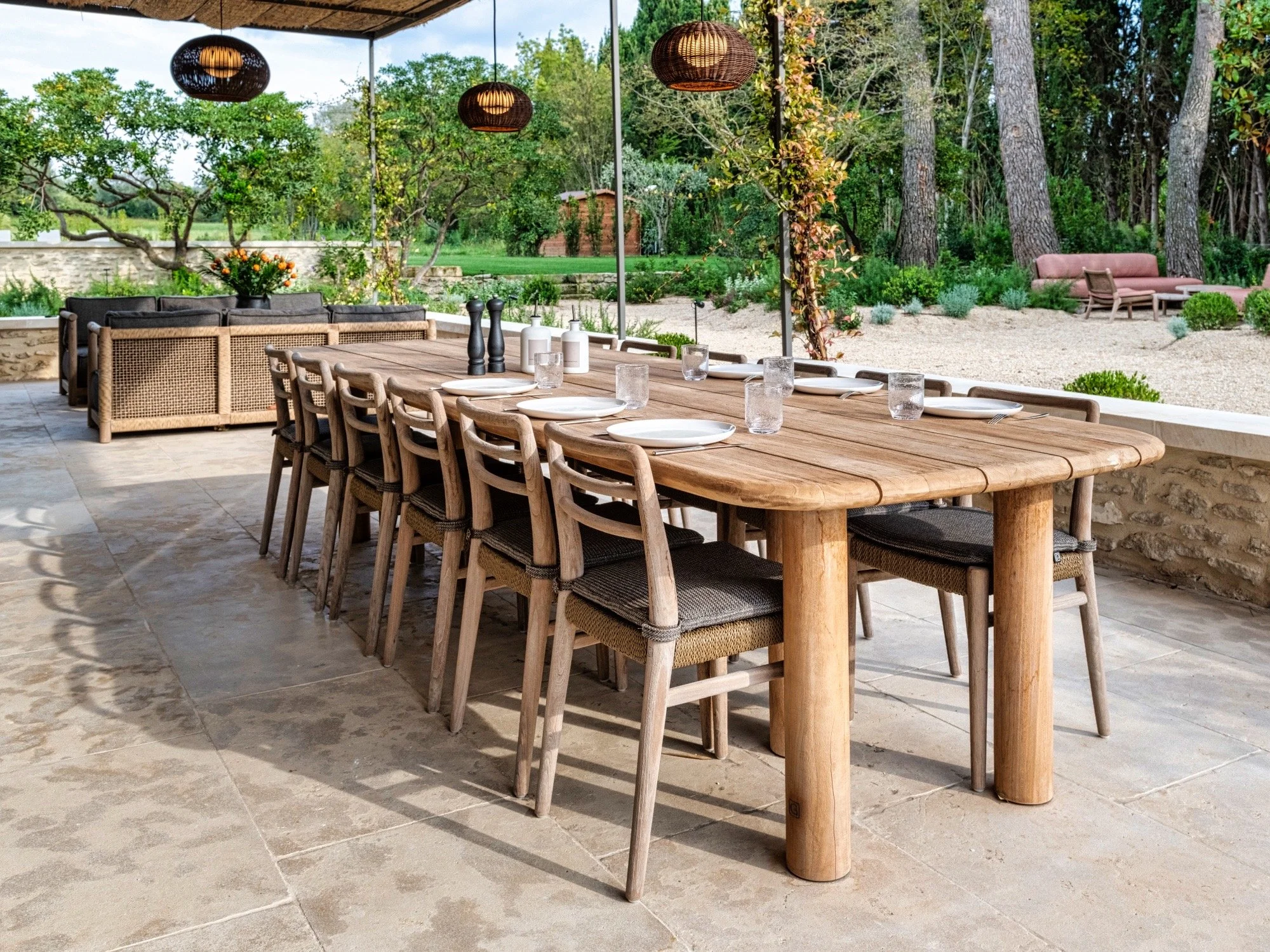 Une terrasse le long de la maison, abritée par une pergola en canisse, accueille une grande table de repas de 12 personnes et un salon extérieur. Le jardin sud propose un deuxième salon extérieur à l’ombre des pins, idéal pour un prendre l’apéritif ;
