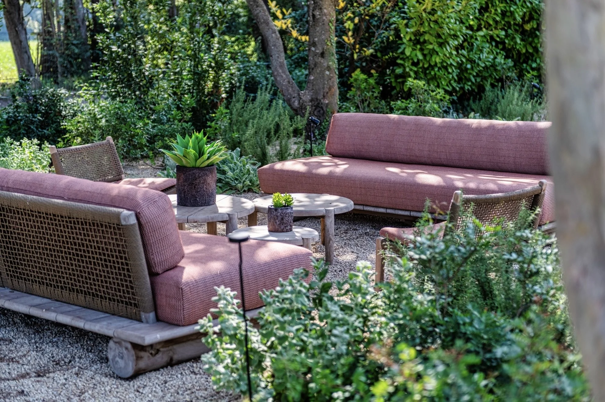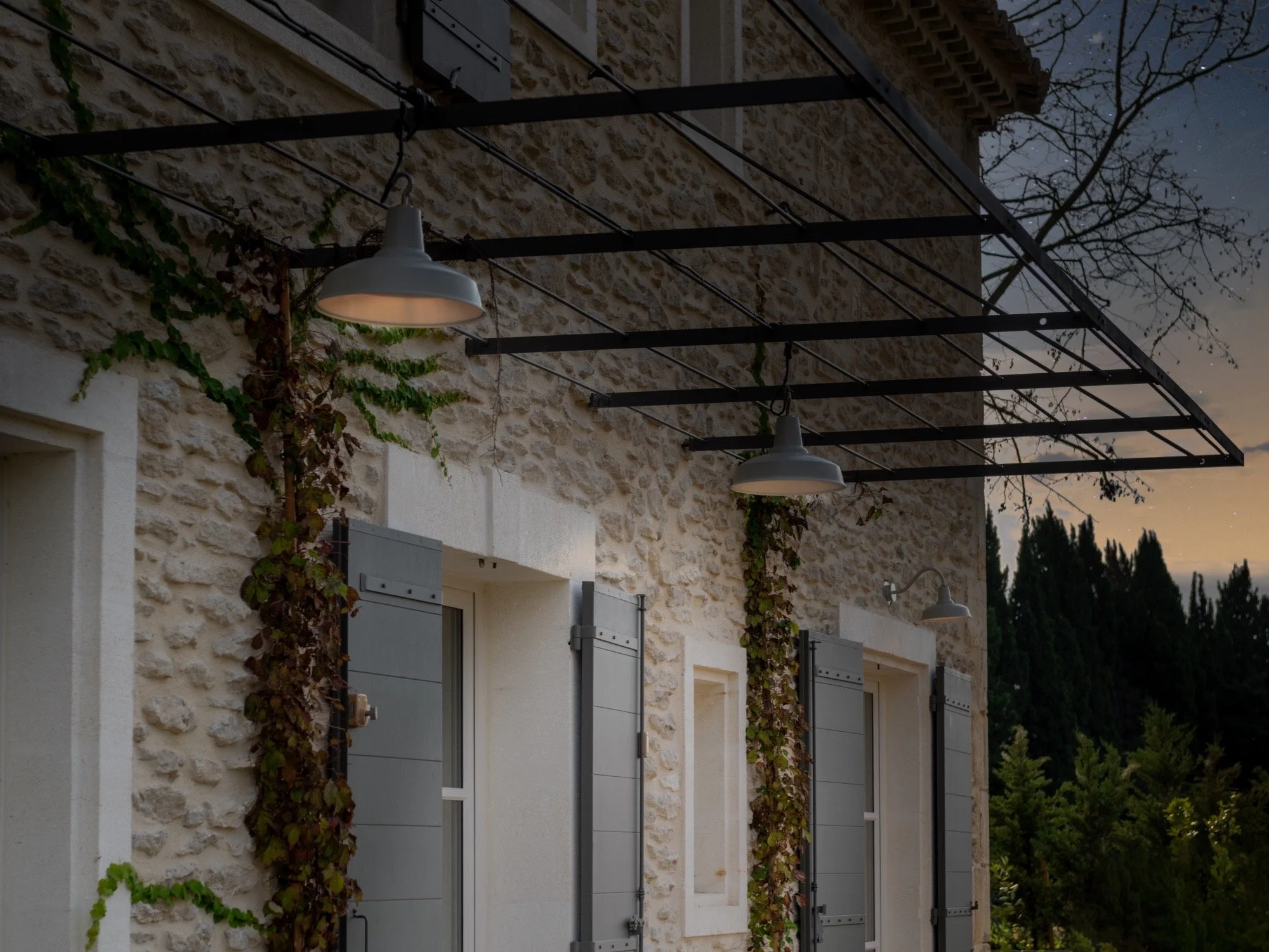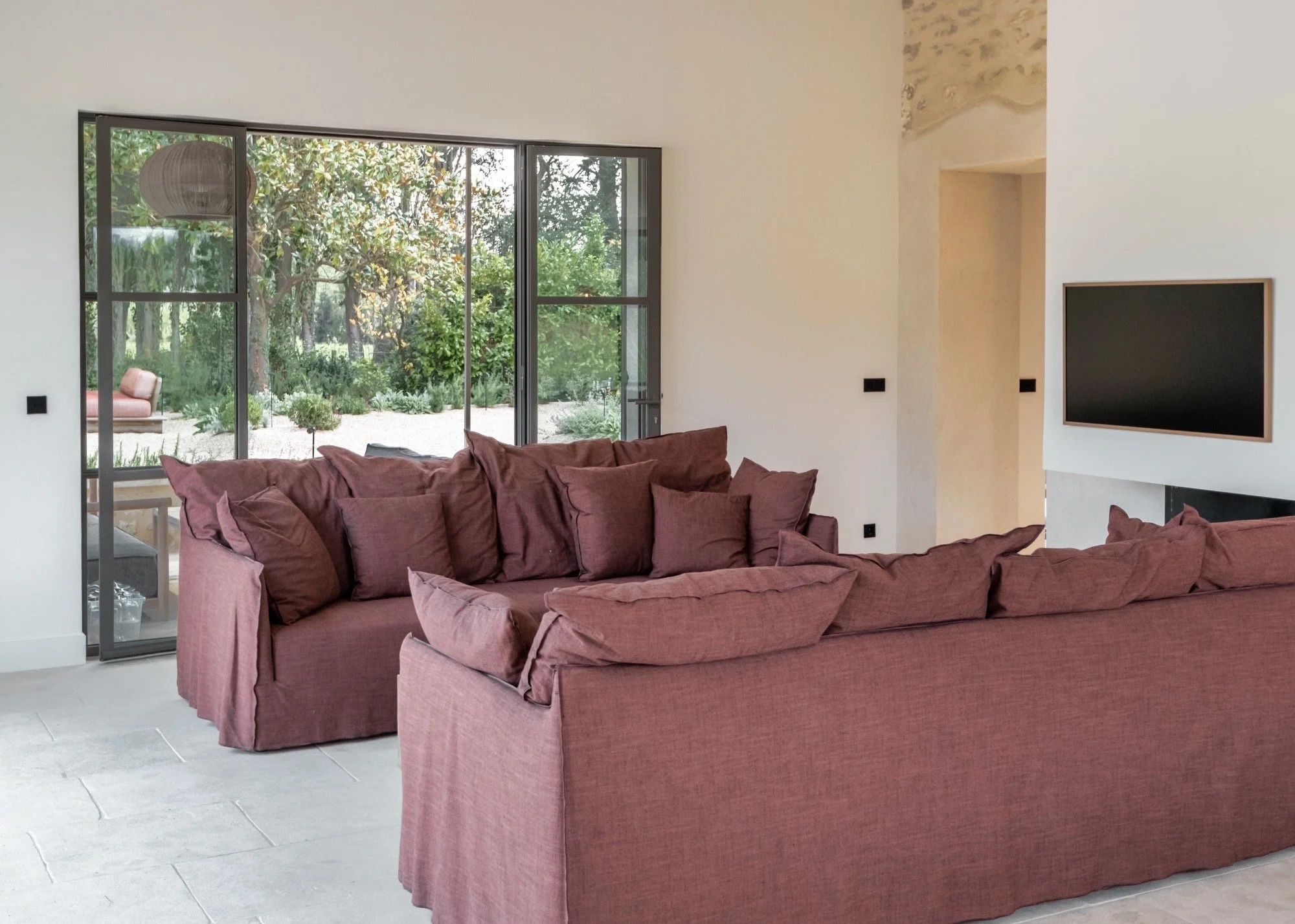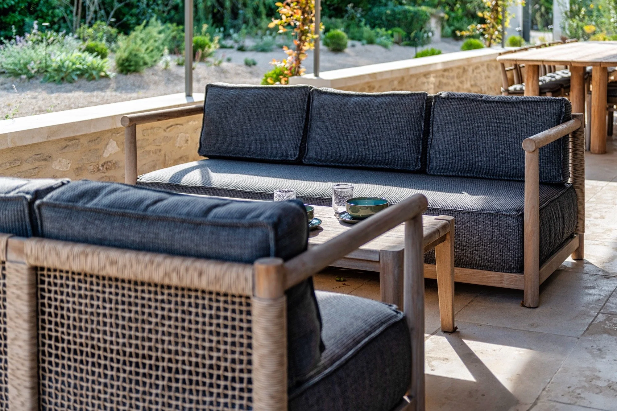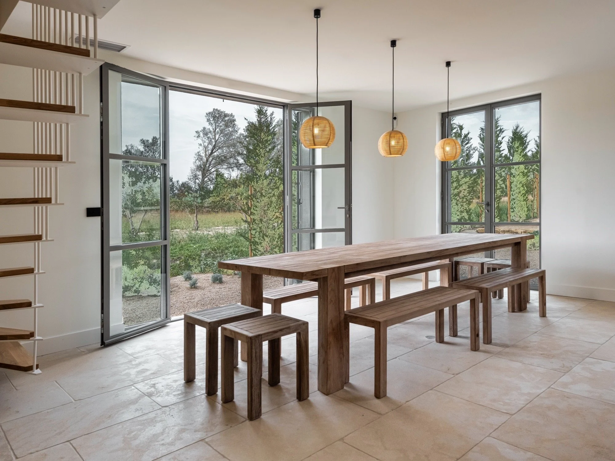 Une terrasse le long de la maison, abritée par une pergola en canisse, accueille une grande table de repas de 12 personnes et un salon extérieur. Le jardin sud propose un deuxième salon extérieur à l’ombre des pins, idéal pour un prendre l’apéritif ;