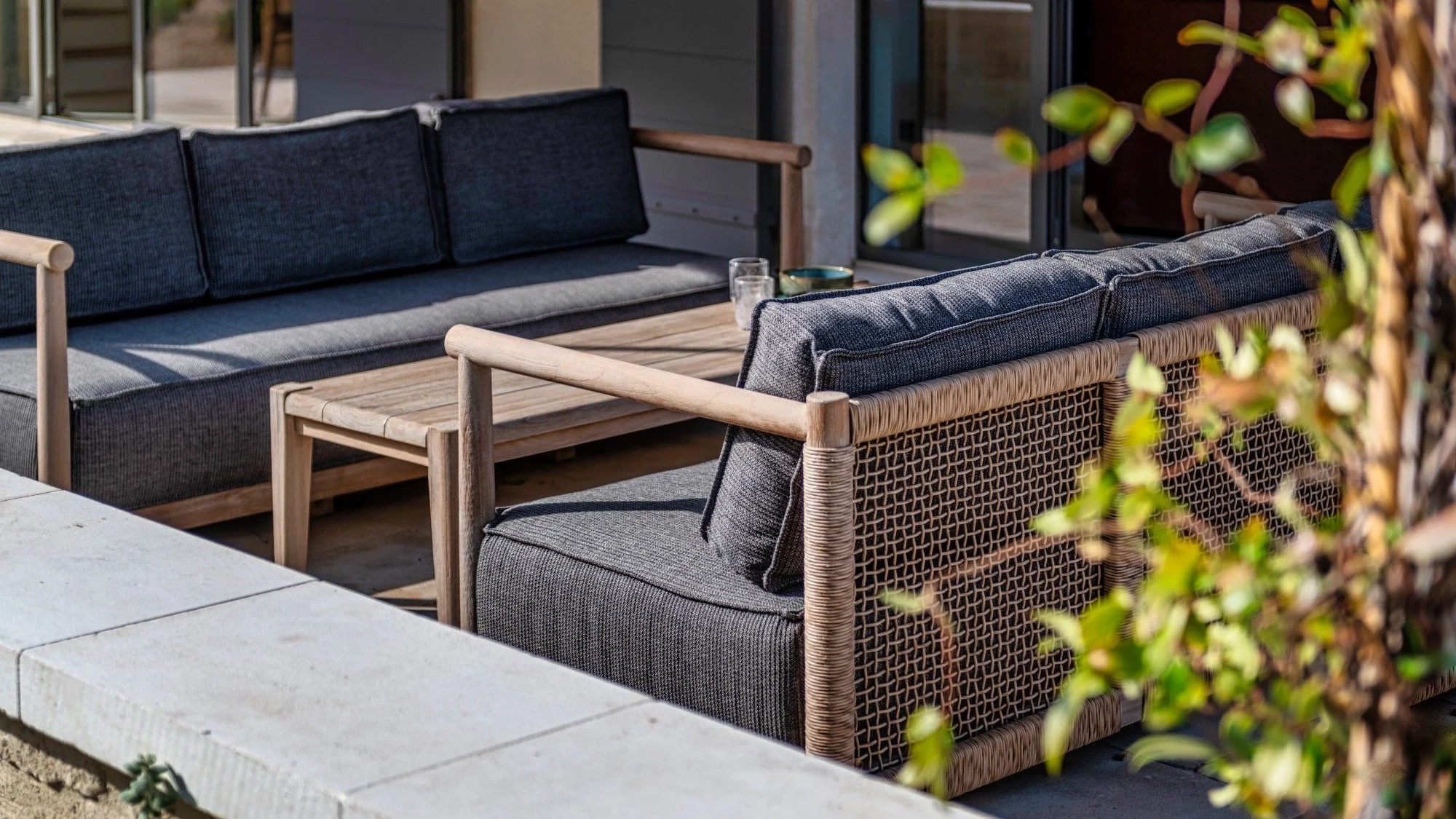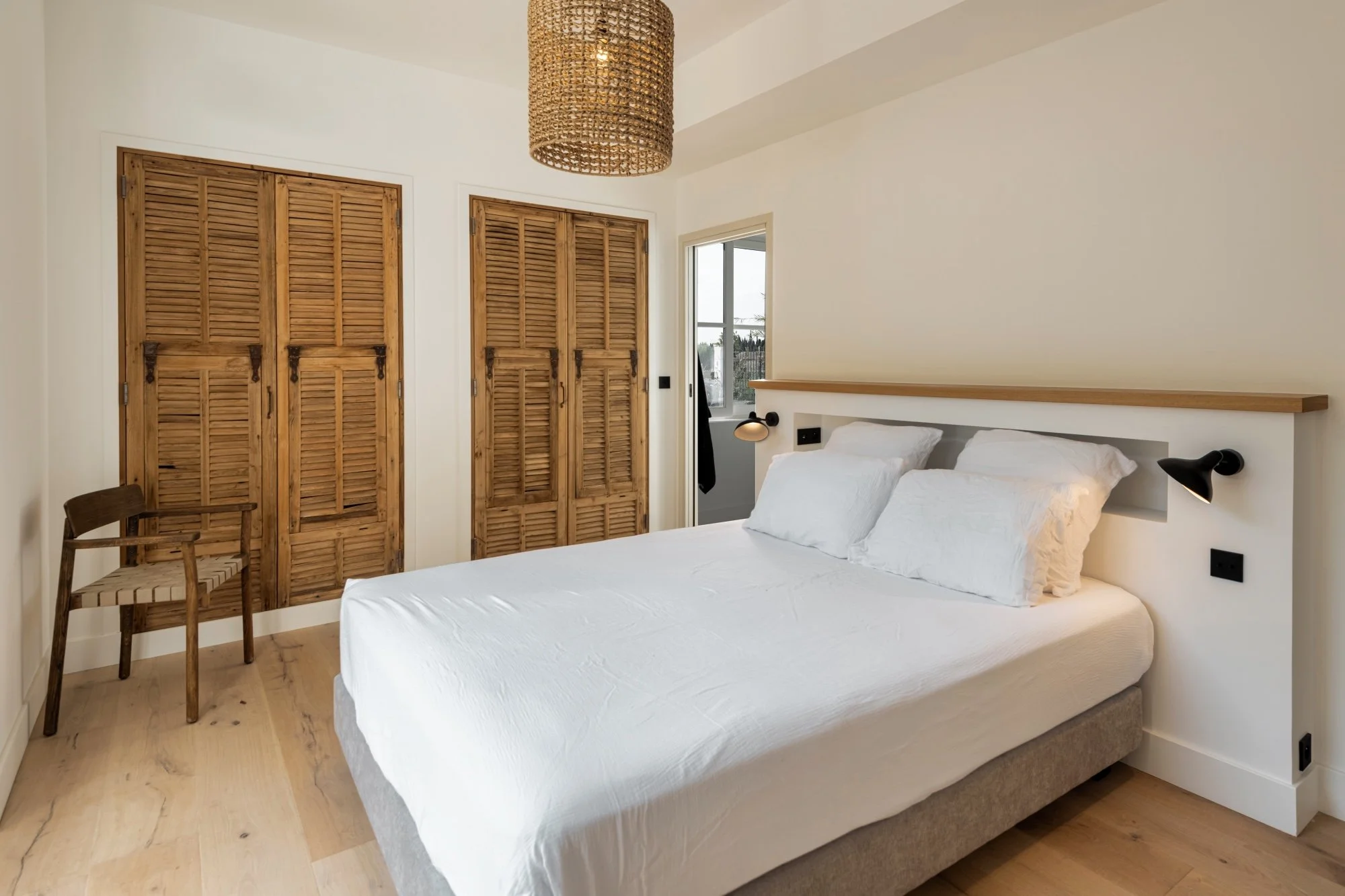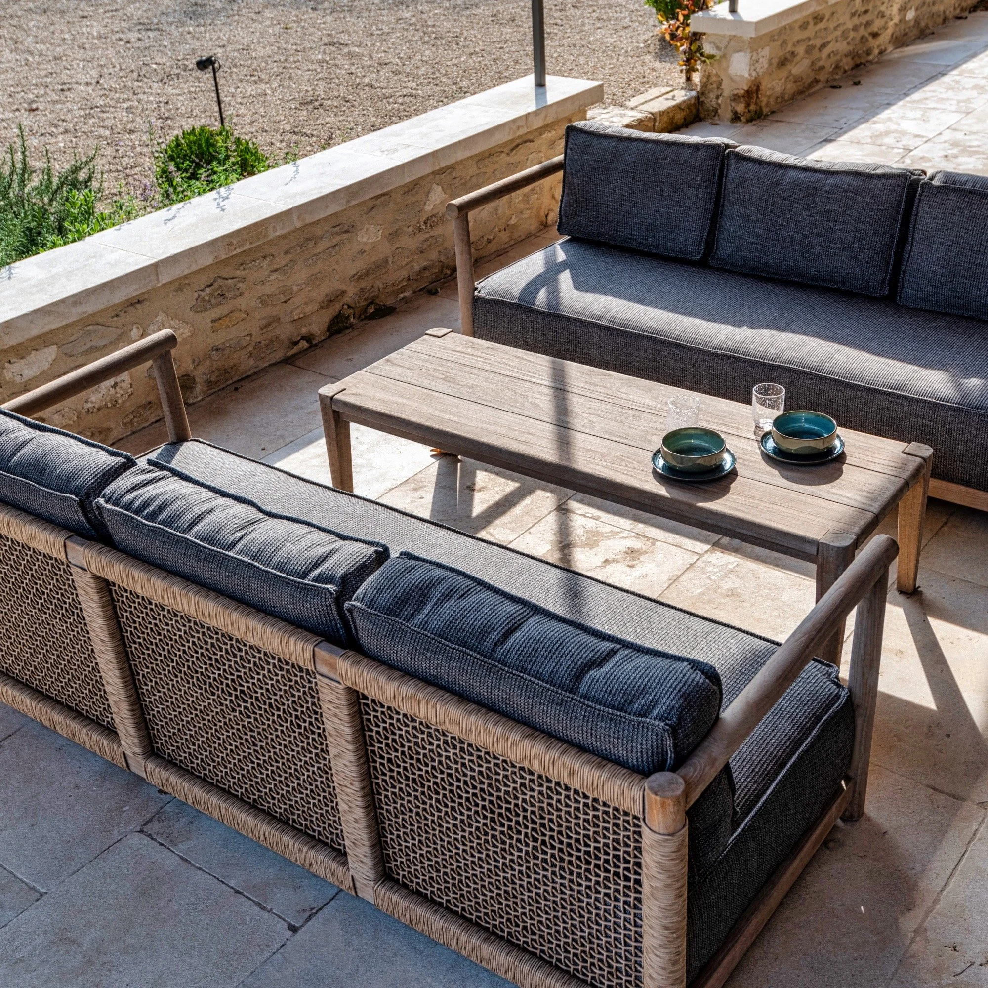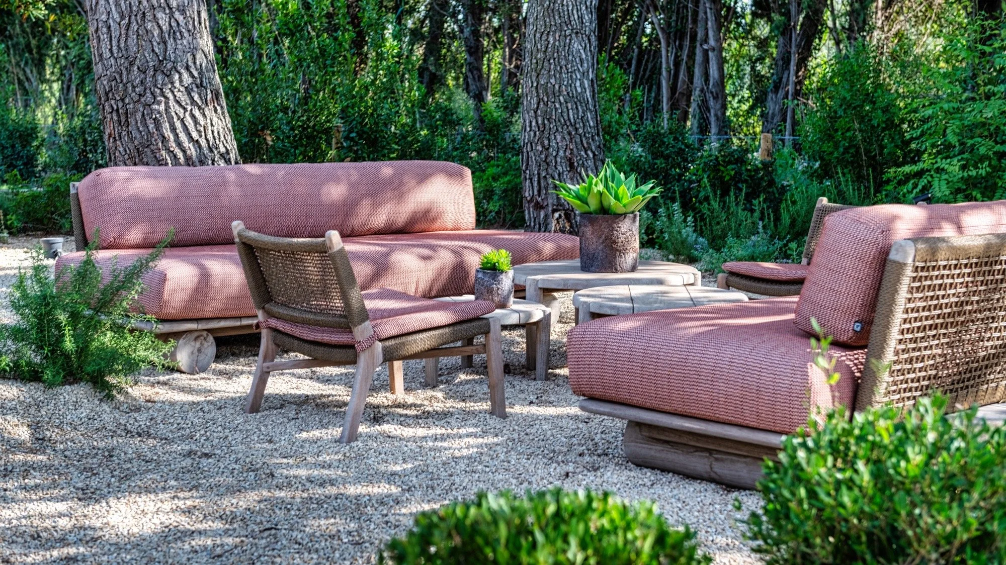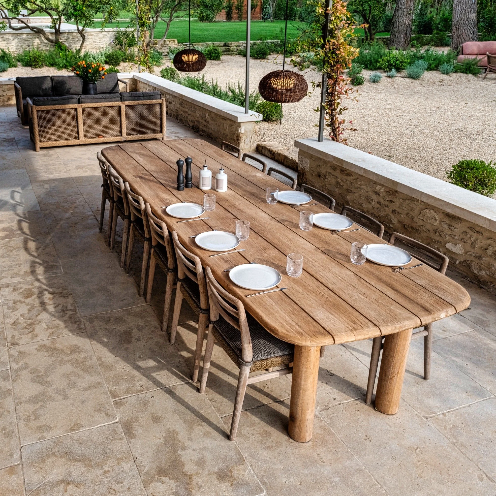 Une terrasse le long de la maison, abritée par une pergola en canisse, accueille une grande table de repas de 12 personnes et un salon extérieur. Le jardin sud propose un deuxième salon extérieur à l’ombre des pins, idéal pour un prendre l’apéritif ;
