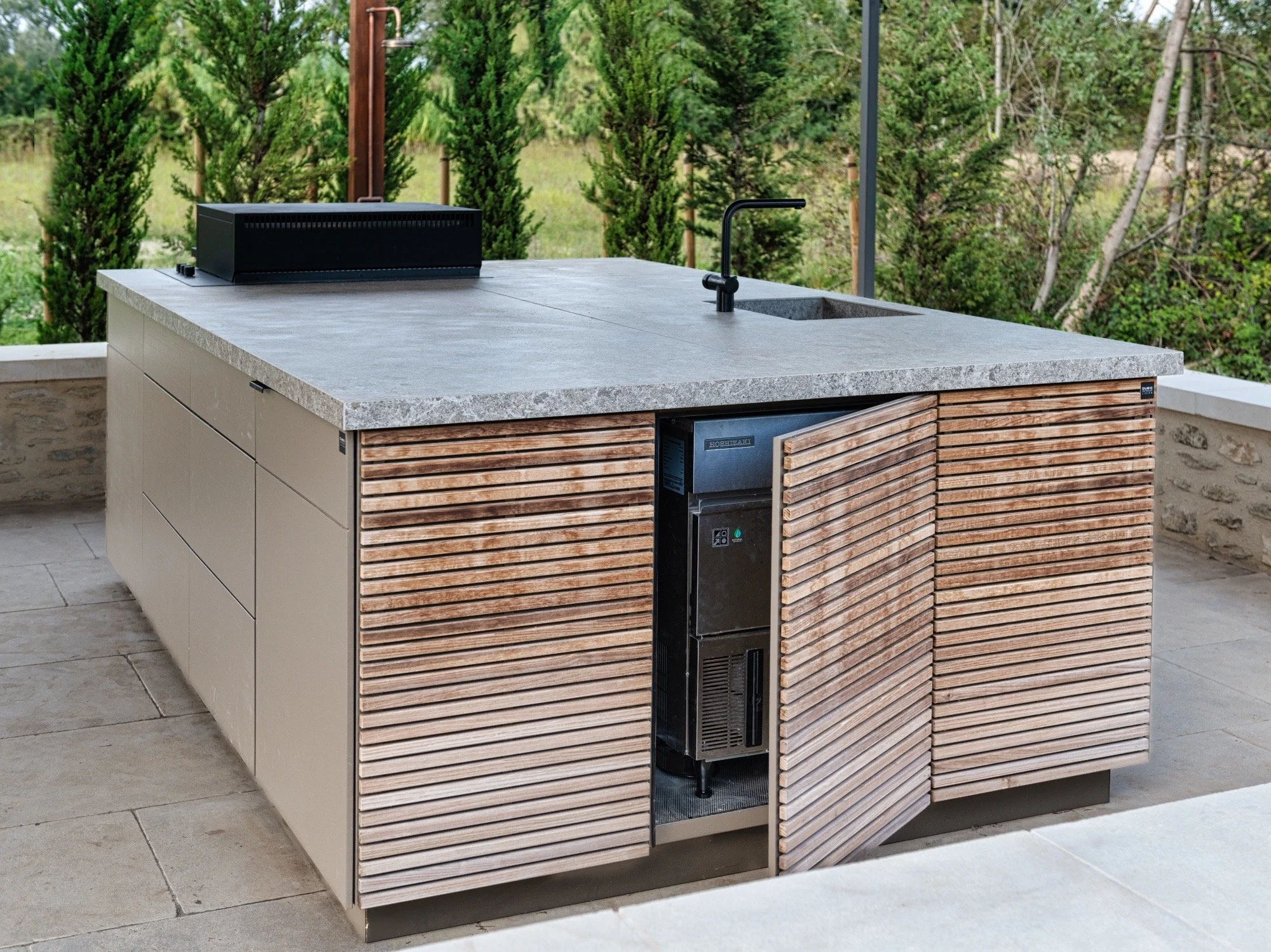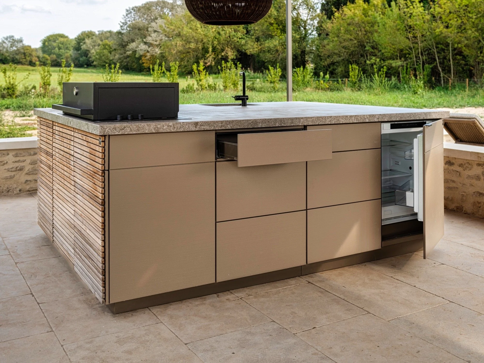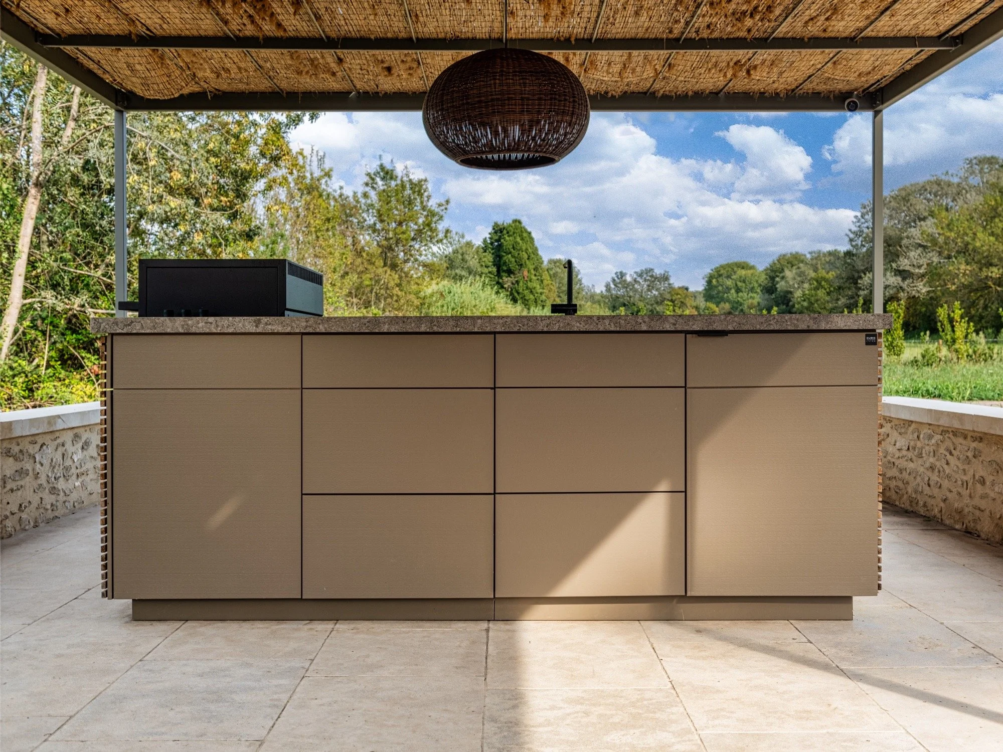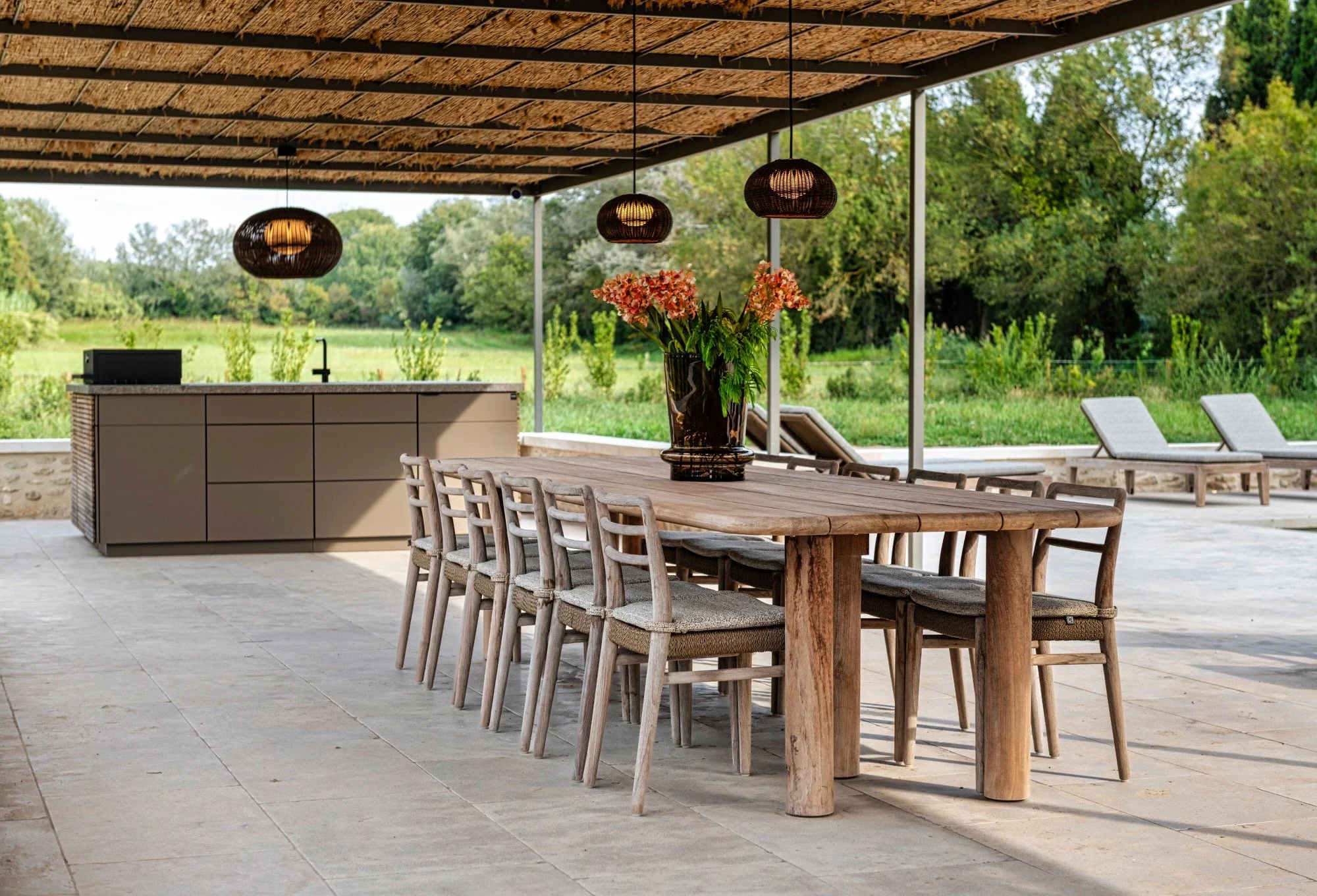 La piscine (chauffable) est entourée d’une terrasse couverte d’une pergola en canisse de plus de 20 mètres de long avec d’un côté, une immense banquette permettant de se prélasser ou bien de prendre un verre en groupe, au centre une seconde grande table de repas de 12 personnes et enfin, une cuisine extérieure de très haut standing (barbecue/plancha à gaz, plaques à induction invisibles, frigo, machine à glaçons professionnelle, lave-vaisselle). 8 chaises longues agrémentent le tour de la piscine ;