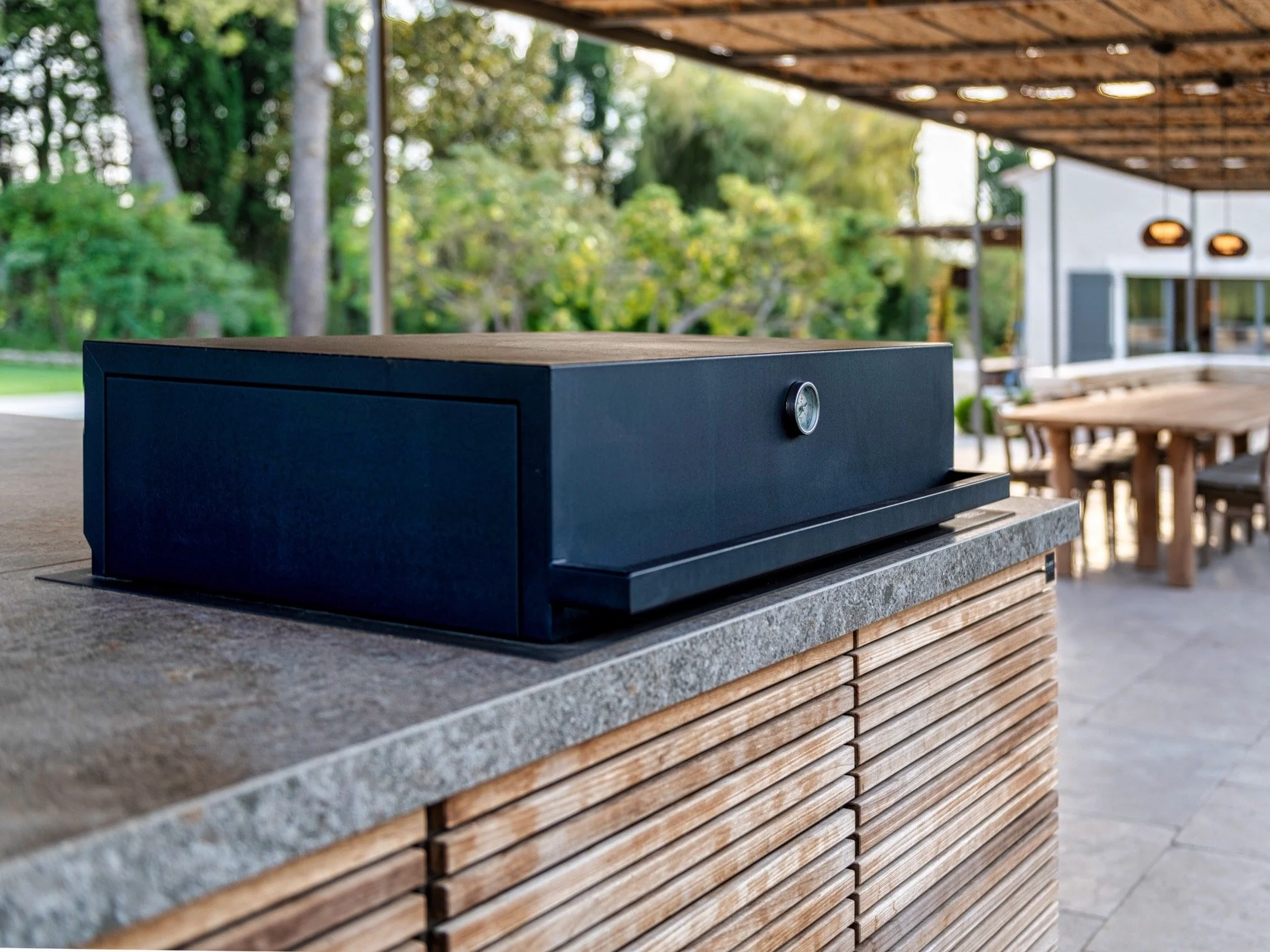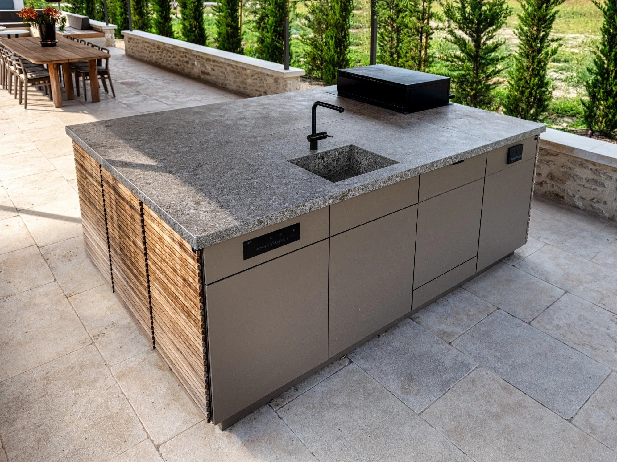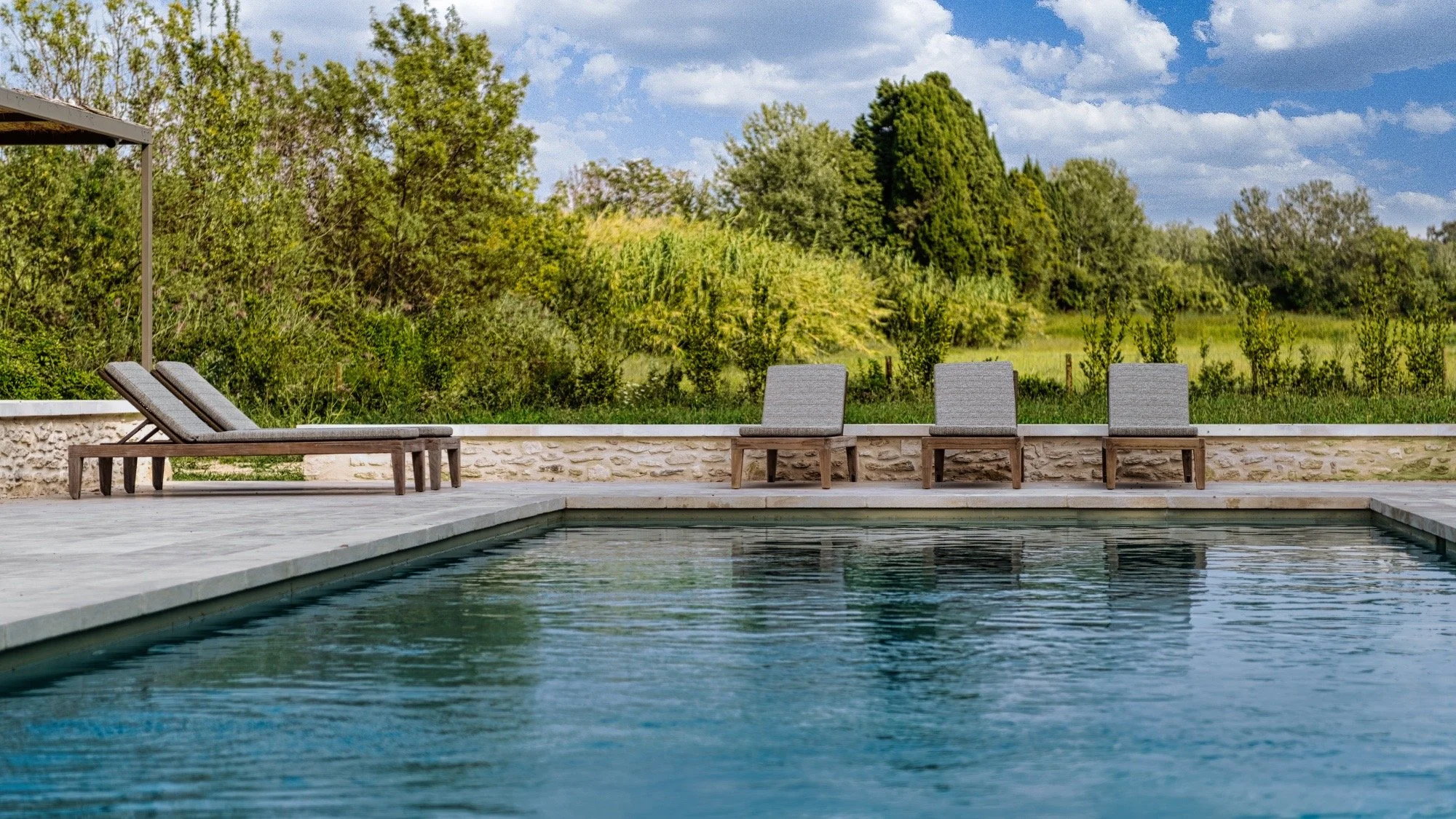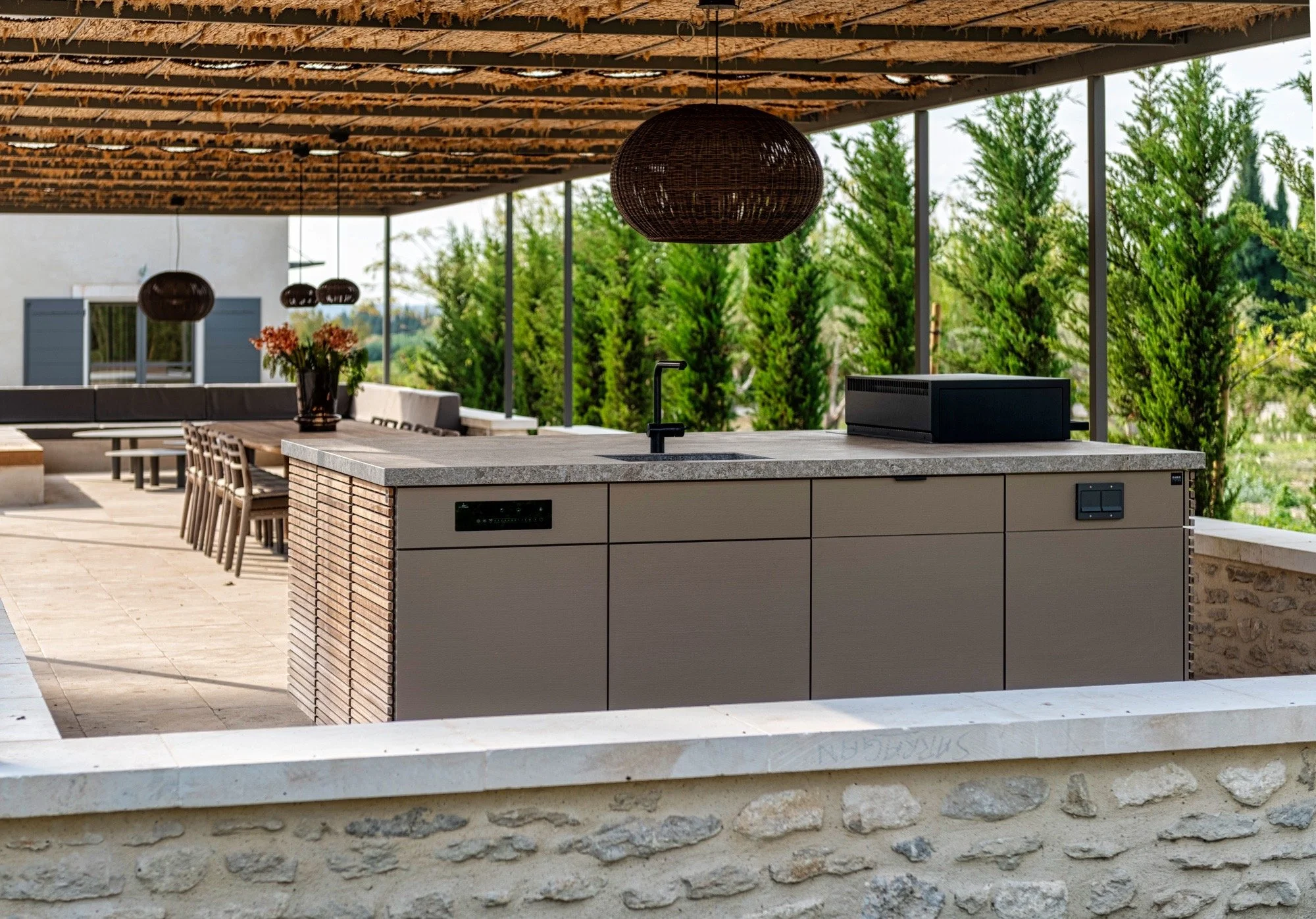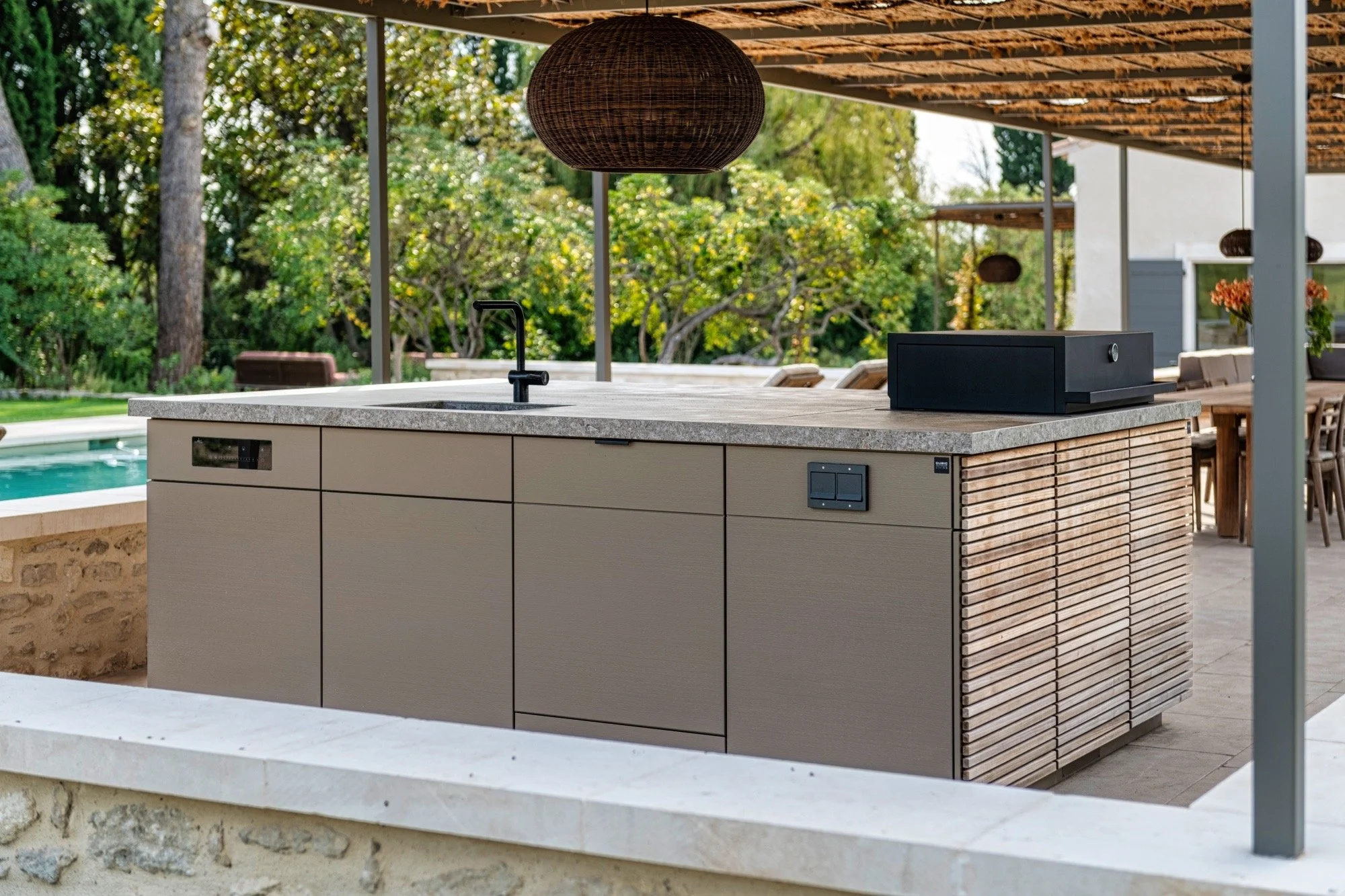 La piscine (chauffable) est entourée d’une terrasse couverte d’une pergola en canisse de plus de 20 mètres de long avec d’un côté, une immense banquette permettant de se prélasser ou bien de prendre un verre en groupe, au centre une seconde grande table de repas de 12 personnes et enfin, une cuisine extérieure de très haut standing (barbecue/plancha à gaz, plaques à induction invisibles, frigo, machine à glaçons professionnelle, lave-vaisselle). 8 chaises longues agrémentent le tour de la piscine ;
