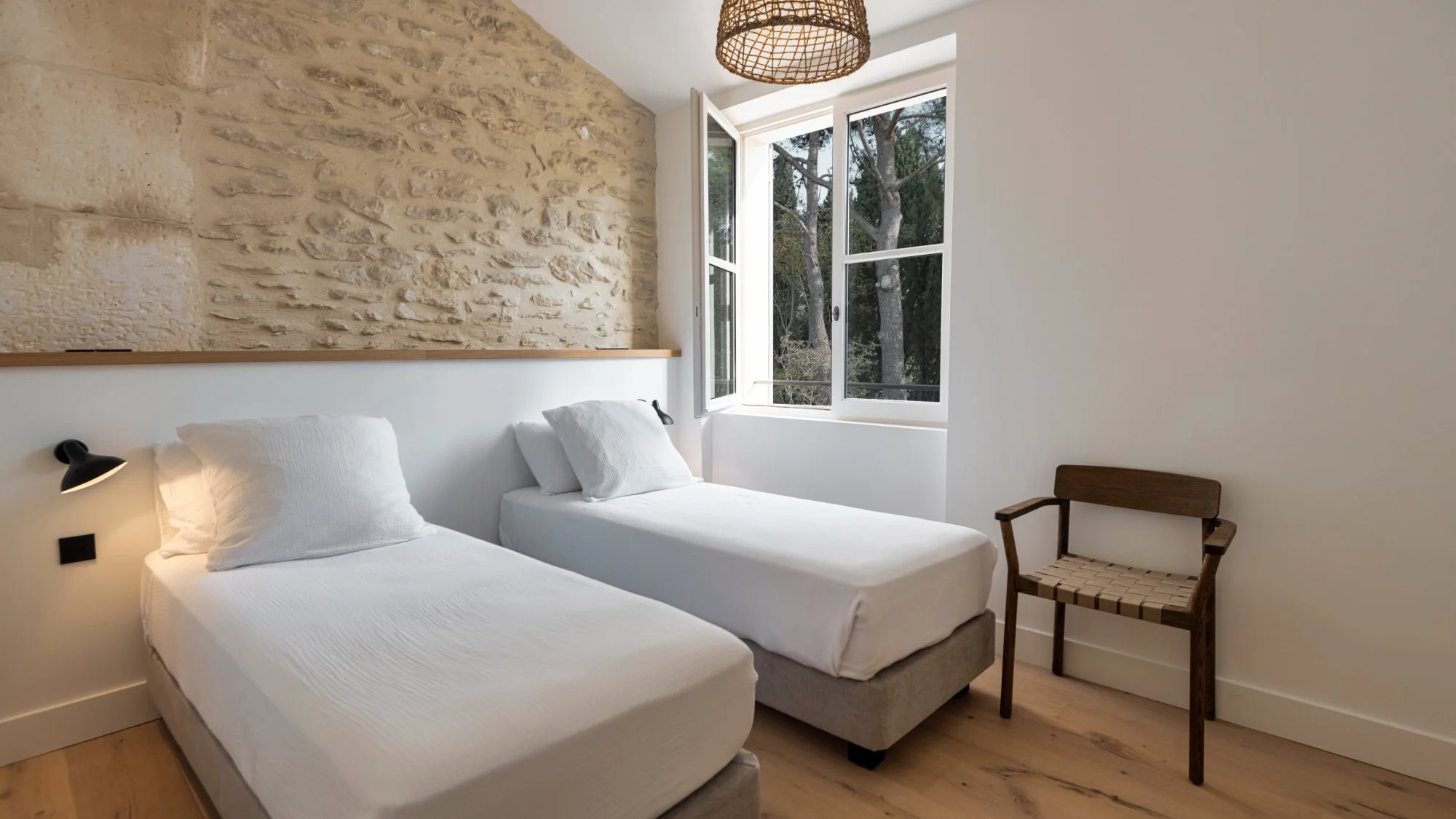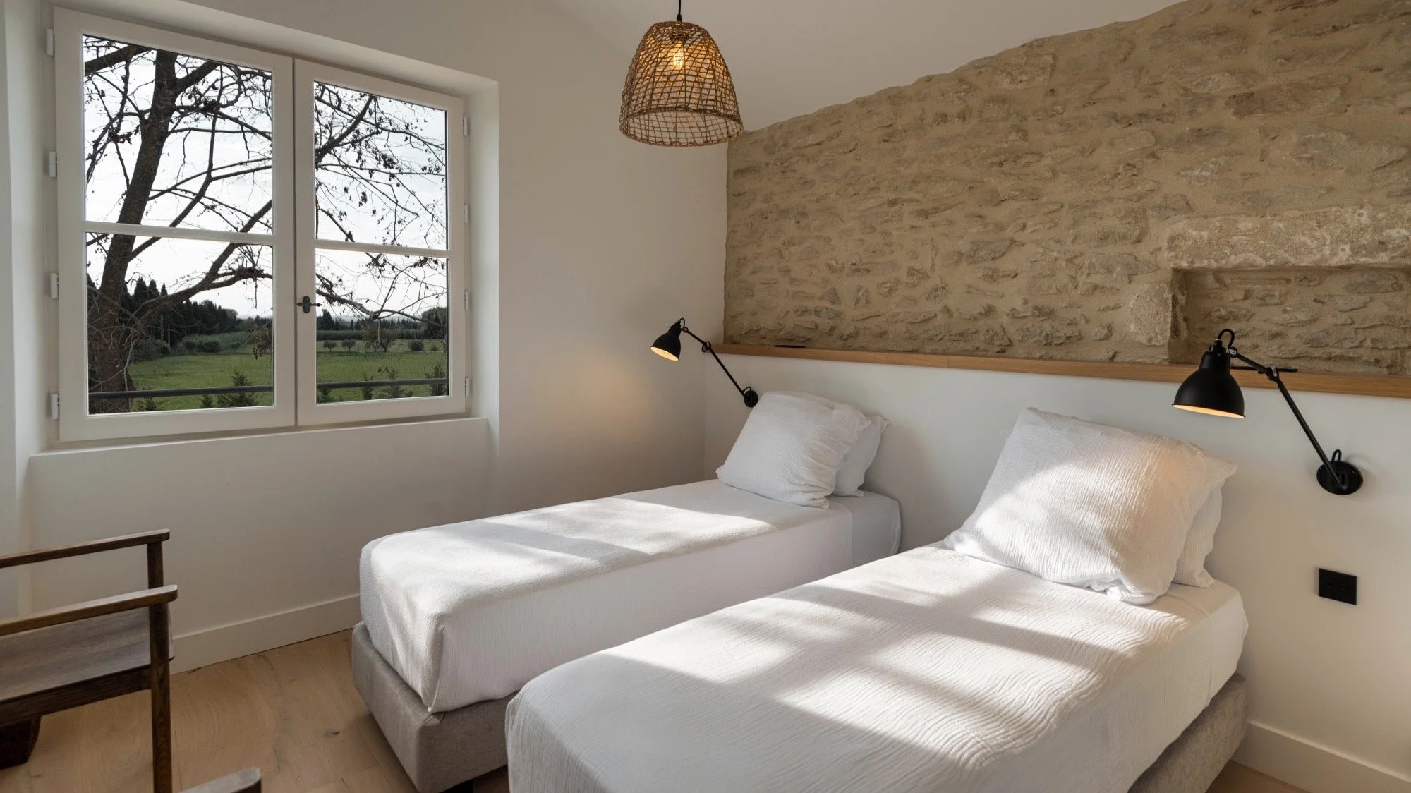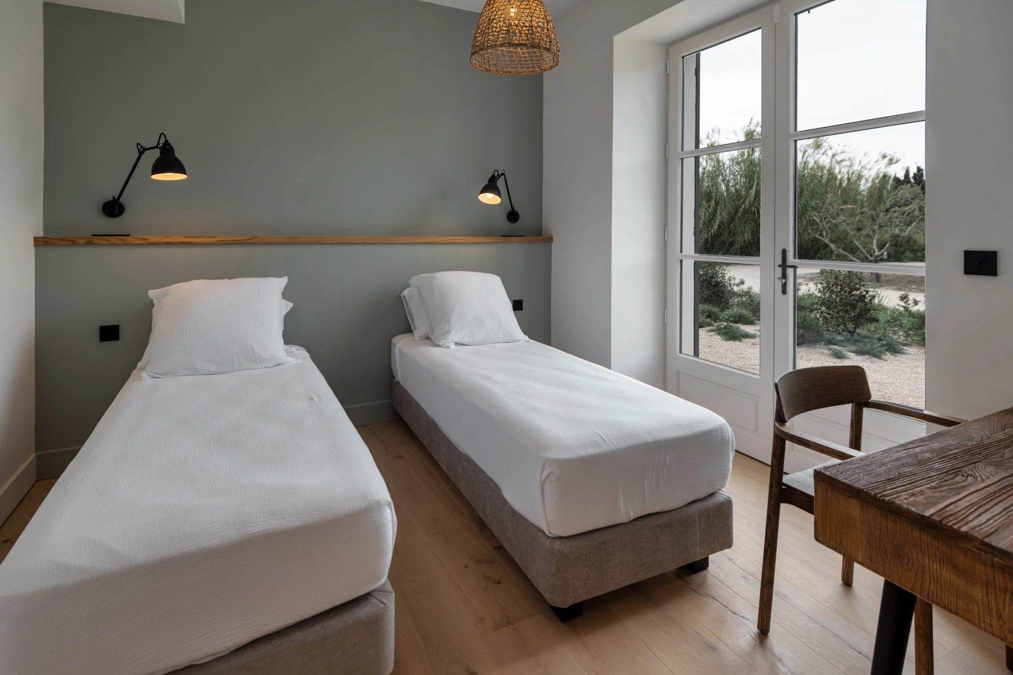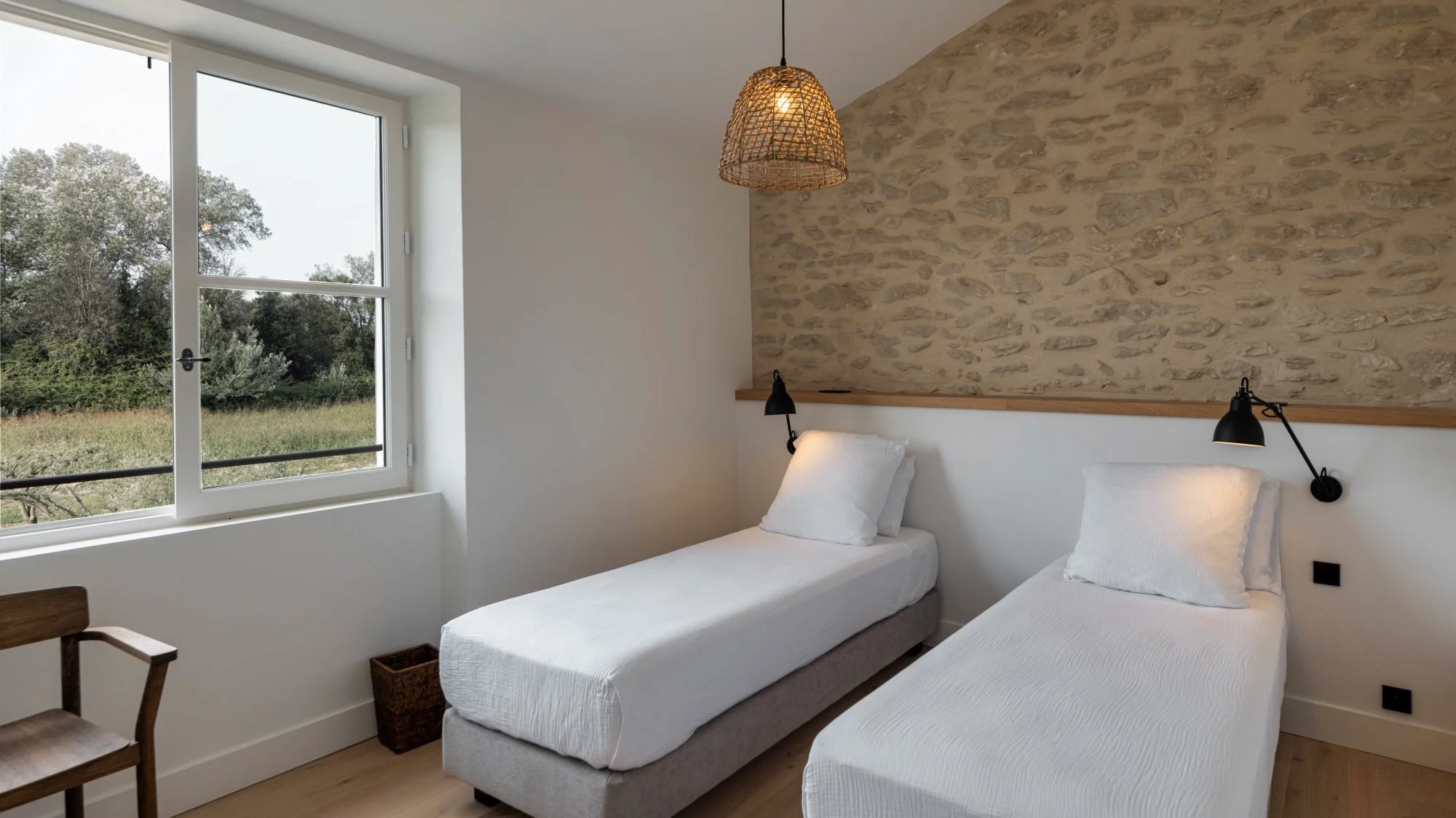4 chambres jumelles ou doubles (rattachement en lit double sur demande) avec salle de bain en suite et toilettes séparées ;
