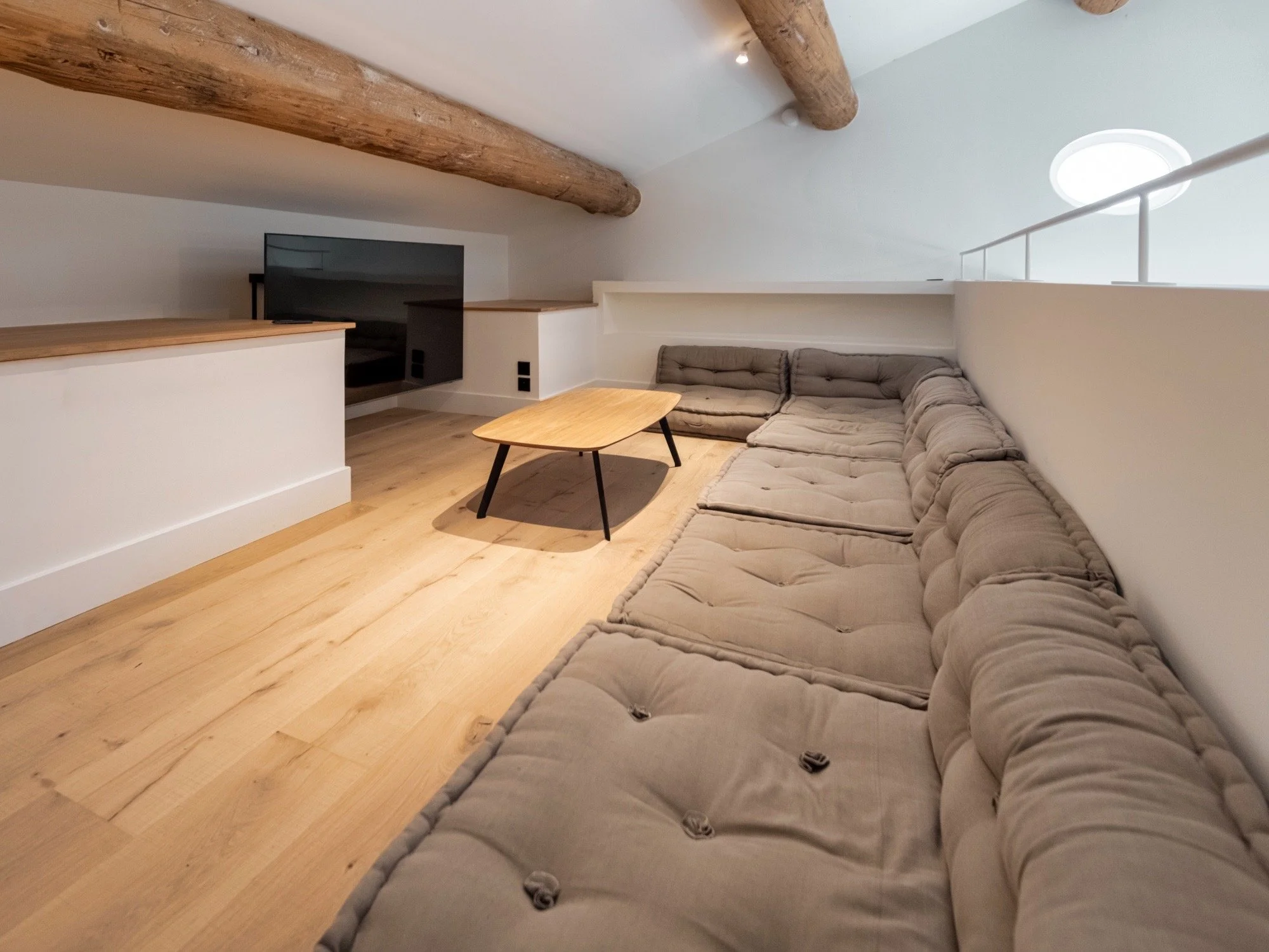 Un très grand salon / salle à manger qui offre en plus une mezzanine faisant office d’espace enfants avec une grande télévision et un espace de jeu. Le salon propose une cheminée avec une télévision au-dessus du foyer ;